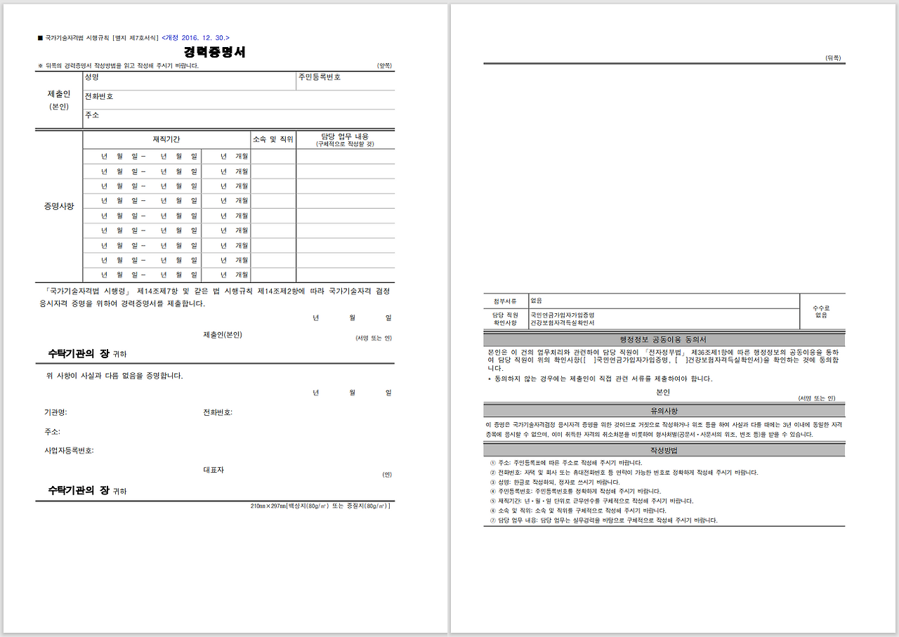 사내 양식도 가능하지만 필수 내용이 있기 때문에 웬만하면 큐넷 양식으로 추천드립니다. ① 동일분야 기능장 (동일종목외 외국자격취득) ② 기능사 + 실무경력 7년 ③ 해당직무 분야 산업기나 또는 기능사 자격 취득 후 기능대학 기능장 과정 이수자 이후 이상이 없다면, 큐넷 홈페이지에 접속하여 자료실로 이동하여 검색창에 '경력증명서'라고 입력하면 됩니다. Jan 08, 2021 · 구분. Mar 28, 2021 · 큐넷 홈페이지에 경력증명서 양식을 제공합니다. 그리고 양식을 작성할 때 서명란을 제외한 나머지는 한 가지의 방식으로만 해야 합니다. Sep 27, 2017 · 이 경력증명서 양식에 다운 받기 앞서 시험 보실 시험에 해당 경력이 인정되는지 확인과 함께 경력기간을 먼저 잘 확인해 보시기 바랍니다. (졸업증명서, 재학증명서, 경력관련 서류 등)를 제출하면됩니다. 졸업증명서, 졸업예정증명서, 재학증명서, 재적증명서, 수료증명서 등; 큐넷 공지사항 '임상심리사 1급, 2급 응시자격. Apr 17, 2018 · 공지 2021년 큐넷 조리기능사 조리복 규정 강화 필독!! Mar 20, 2018 · 큐넷 응시자격 서류 제출, 온라인 제출 안될 때는 등기로. 경력증명서(담당업무가 상세히 기재된 것에 한함), 4대보험 가입증명서(건강보험, 국민연금, 고용보험 중 택1), 자영업인 경우 사업자등록증명원 1부 등
